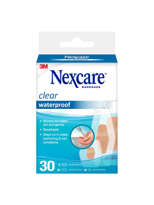 Nexcare Clear Waterproof Assorted bandages are durable, transparent adhesive dressings designed to protect minor cuts, grazes, and abrasions from water, dirt, and germs. Their clear design makes them discreet on skin, while the waterproof construction helps keep wounds dry during daily activities like washing hands, showering, or outdoor fun. With assorted sizes to suit a range of common first aid needs, these bandages offer secure, everyday protection you can rely on.
