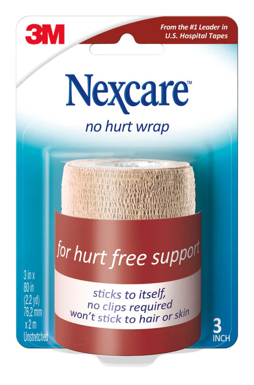 Nexcare No Hurt Wrap Tan is a comfortable, flexible first aid wrap designed to securely support joints, sprains, strains, and minor injuries without causing discomfort. This gentle, tan-coloured elastic wrap conforms easily to body contours, providing reliable support and holding dressings in place while allowing freedom of movement. Ideal for first aid kits, injury care, and everyday support needs.