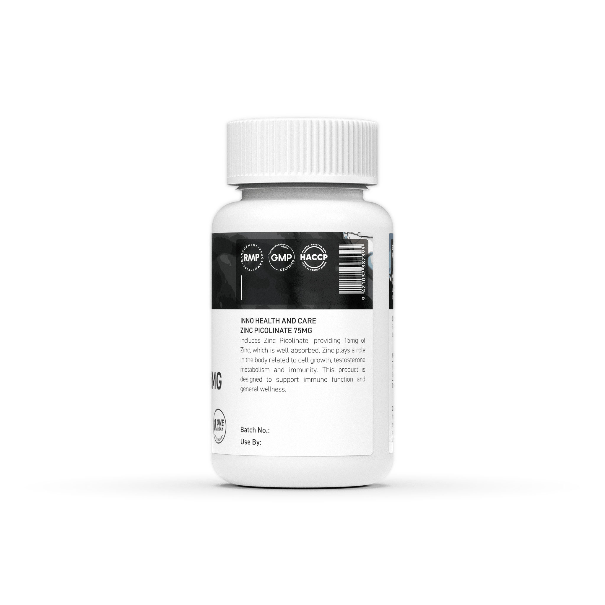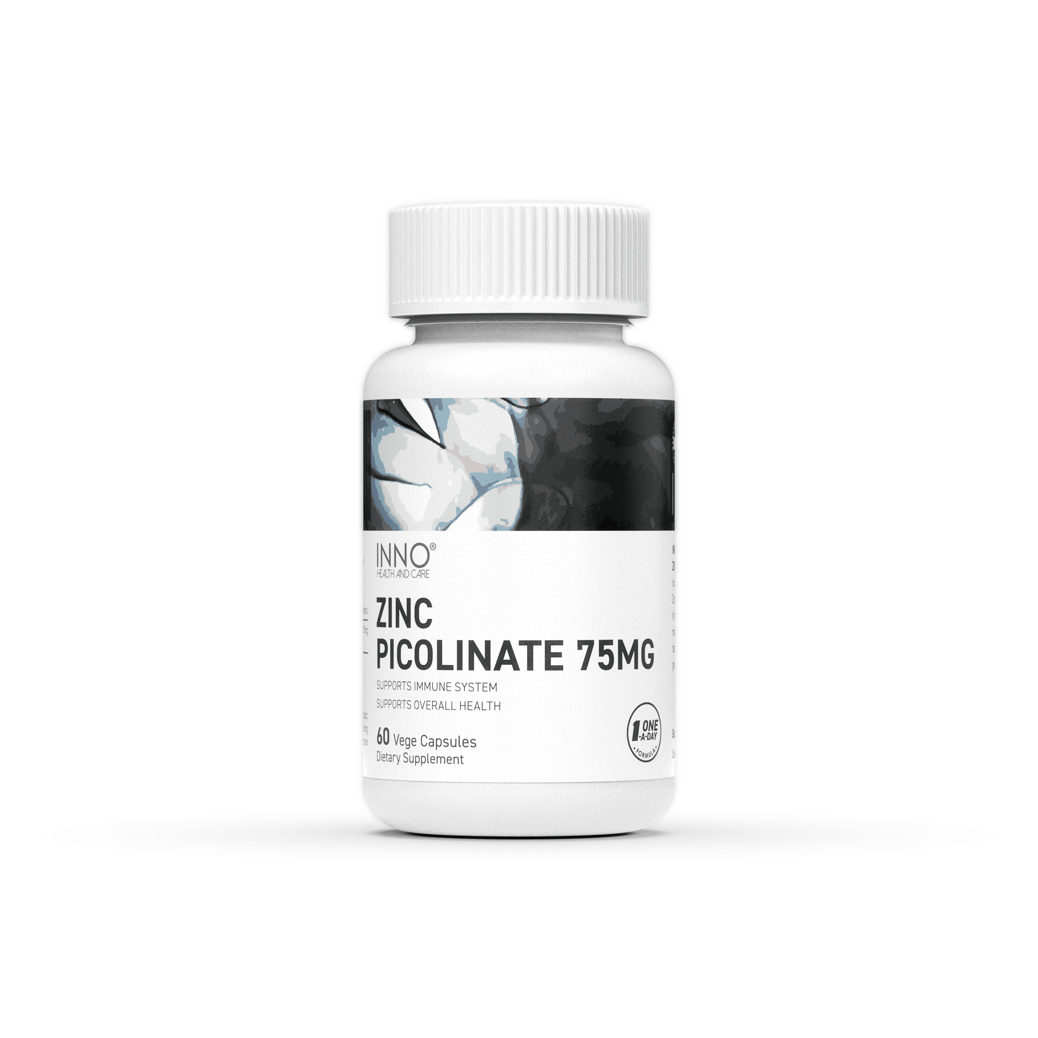 INNO Zinc Picolinate 75mg is a high-strength zinc supplement formulated with zinc picolinate for enhanced absorption. It supports immune function, skin health, and cellular repair as part of a daily wellness routine.