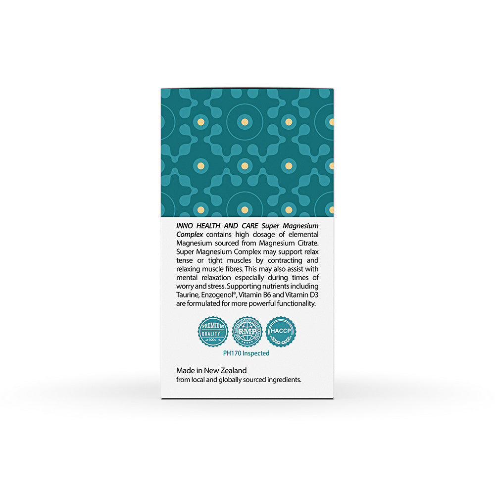 INNO Super Magnesium Complex is a premium magnesium formula designed to support muscle function, nervous system health, and relaxation. It helps reduce fatigue and supports overall wellbeing as part of a daily wellness routine.