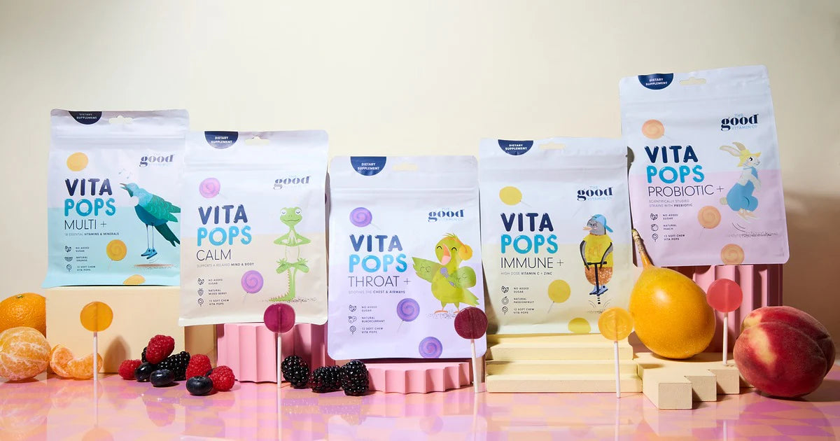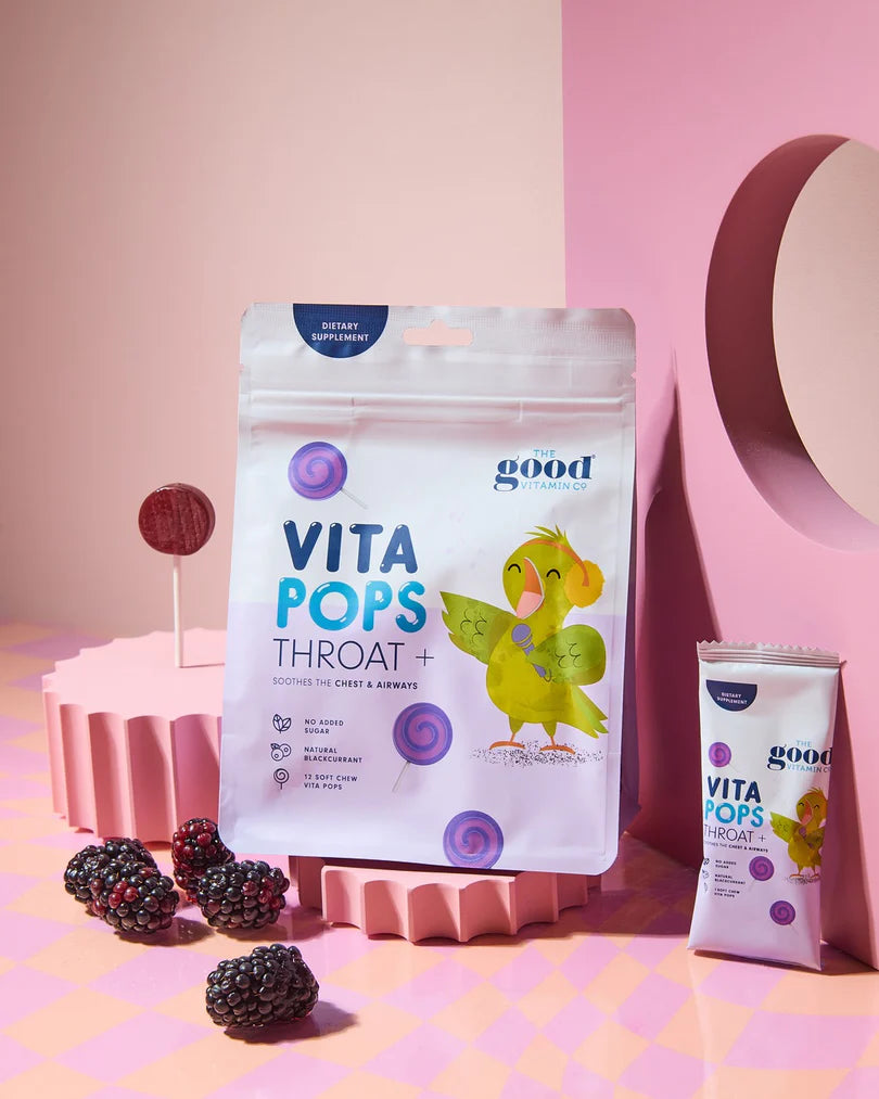 Kids Vita Pops Throat+ is a fun, soft-chew supplement designed to help soothe the throat and support respiratory and immune health in children aged 2 years and over. Formulated with a blend of botanical extracts, vitamin C, and zinc, these naturally flavoured pops are gentle, easy to take, and ideal for everyday wellbeing.